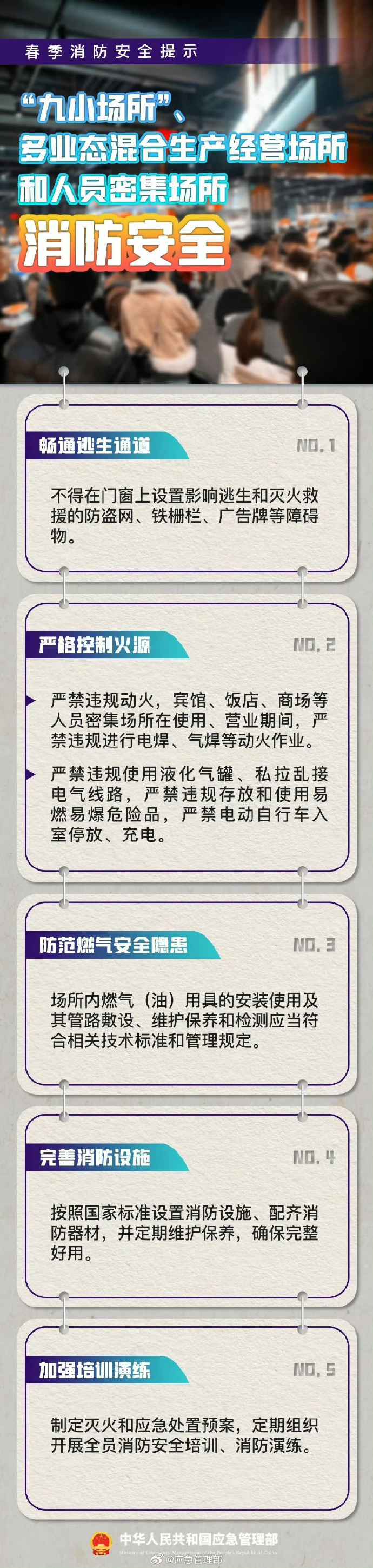 春季天干物燥,大風天氣多,一個小火星就可能引起火災(zāi)。因此,在生活生產(chǎn)中,一定要注意防范安全隱患。 “九小場所”、多業(yè)態(tài)混合生產(chǎn)經(jīng)營場所、人員密集場所等要注意哪些事項?
